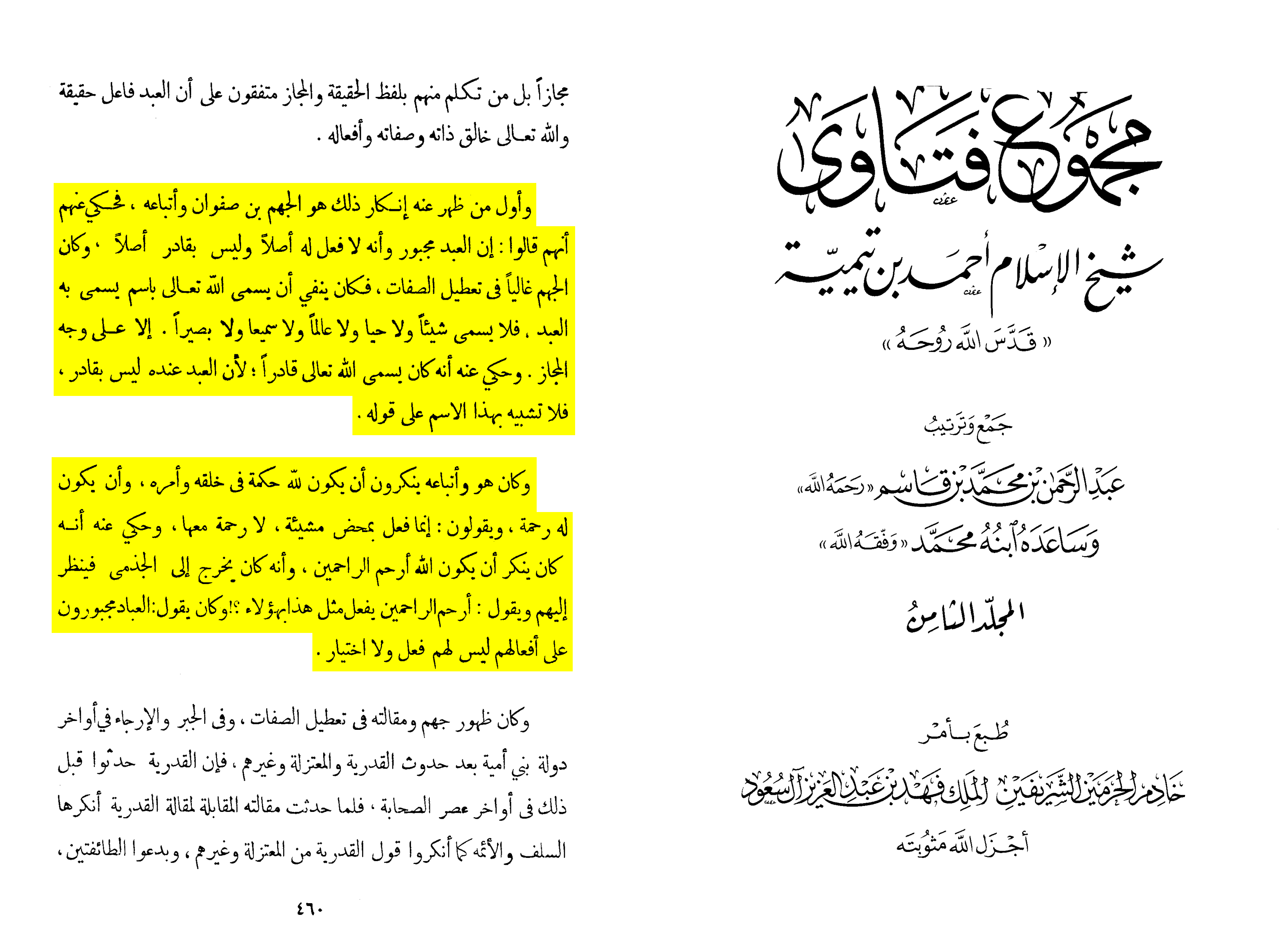 Ibn Taymiyyah (d. 728 AH): El a spus că Jahm ibn Safwan a fost primul care a răspândit în mod deschis aceste doctrine ale jabr și taʿtil. El a relatat că Jahm a negat că Allah ar putea fi numit cu nume împărtășite cu creația, astfel încât el nu L-ar numi shayʾ, hayy, ʿalim, samiʿ sau basir decât la figurat. Ibn Taymiyyah a menționat, de asemenea, negarea de către Jahm a faptului că Allah este arham al-rahimin și batjocura sa atunci când se uita la oamenii cu lepră, spunând "Oare Cel mai Milostiv dintre cei milostivi le-ar face acest lucru?" (Majmuʿ al-Fatawa 8/460)